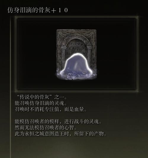 3. 使用策略:召唤出的泪滴会使用你当前装备的武器、法术和道具。因此,在召唤前装备上强力的武器、护符和可投掷道具(如飞刀、壶),能让它的战斗力最大化。它尤其擅长使用各种战技和持续性法术。